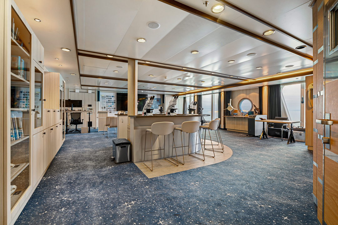 Fartygets vetenskapscenter, som byggts ut och uppgraderats med ännu mer utrustning under 2022, ger dig en djupare förståelse för regionerna vi utforskar. Delta i föreläsningar, undersök prover med kraftfulla mikroskop och prata med expeditionsteamet. Det här är vår stora kunskapskälla ombord.