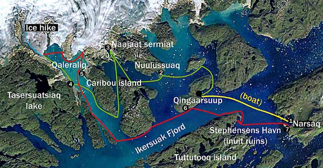 Transport by zodiac boat to Qingaarsup island, where we will start the kayak expedition. We will follow the coast along the ice covered fiord among the icebergs coming from Eqalorutsit glacier. In this area, full of ringed seals, there is usually a greater density of ice, slowing down the kayak and sometimes even blocking access at certain locations. When we start the crossing to Nuulussuaq peninsula through we get the first views of the Inlandis, the polar cap. Once we arrive to Nulussuaq, we will install our camp and have a spot which was one of the Viking settlements in South Greenland. Night in tents.