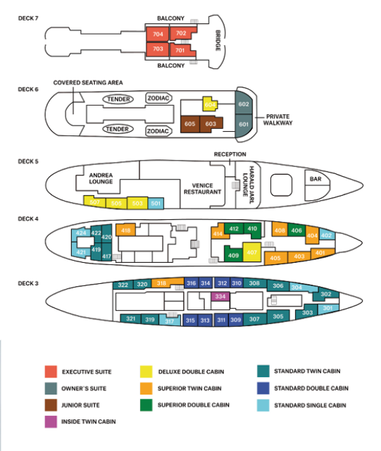 När du seglar genom Svalbards storslagna landskap kan du njuta av bekväma och inbjudande hytter ombord på MS Serenissima. Oavsett om du väljer en mysig hytt eller en rymlig svit är varje utrymme utformat för att ge dig en avkopplande viloplats efter en dag fylld av arktiska upplevelser. Med klassisk maritim charm och moderna bekvämligheter erbjuder Serenissimas hytter och sviter en behaglig resa, så att du kan luta dig tillbaka och njuta av den fantastiska utsikten över den vilda, isklädda naturen.
